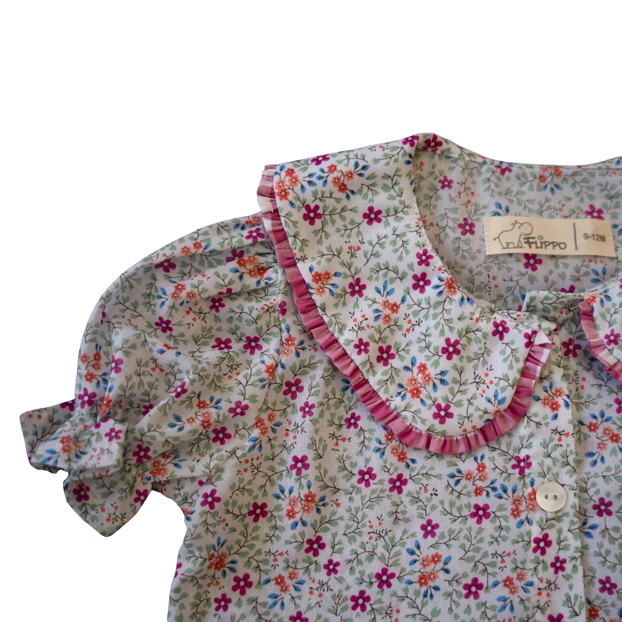 Blusa niña con cuello y mangas vuelitos, 100% algodón peruano. Flores colores